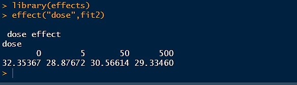 协方差分析比较的是修正均数,即去除了协变量效应后的组均值,可以使用effects包中的effect()函数计算控制了怀孕时间影响后,不同药物剂量组的出生体重的均值。代码和结果如下: