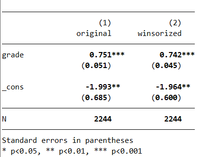 哇塞,缩尾处理简直是给回归分析打了一针强心剂!处理后,grade系数从0.751降到了0.742,标准误也从0.051降到了0.045,下降了12.75%!这表明模型的稳定性更强了,不再那么受异常值的干扰。而且,grade的系数依然显著为正,说明教育水平对工资的正向影响是板上钉钉的事,缩尾处理后这个结论依然坚如磐石。总的来说,缩尾处理让回归分析更加靠谱,结果更加可信,真是棒棒哒!