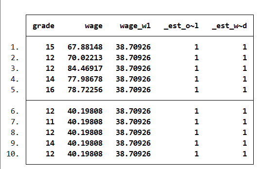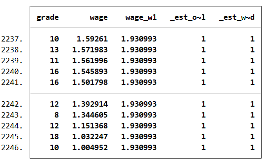 sysuse nlsw88, clear // 调用Stata内置数据keep wage grade //保存工资、教育等级主要数据gsort -wage //按工资降序排列set seed 12345 //设置随机数生成器的种子值replace wage=runiform(50,100) in 1/5 //在前五行人工插入异常值list in 1/10 //插入异常值后,展示前十行数据