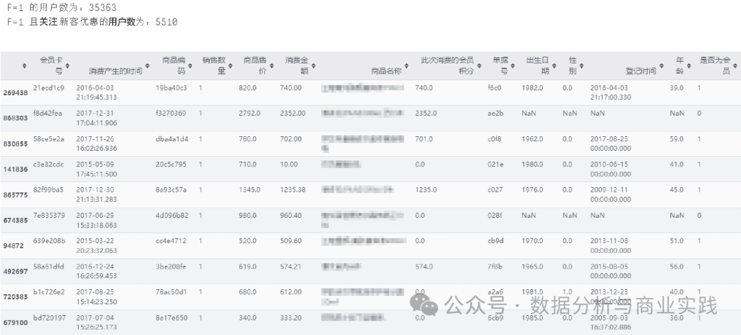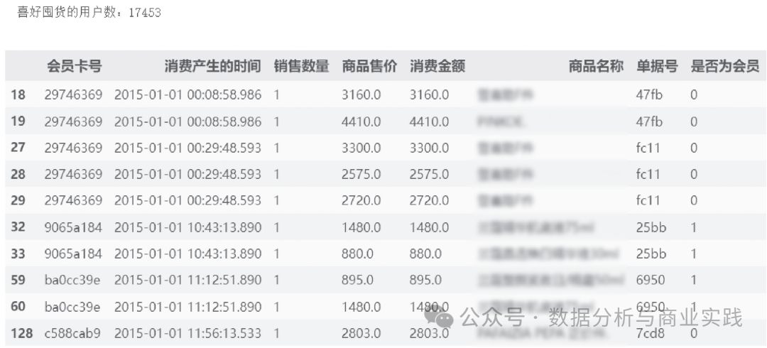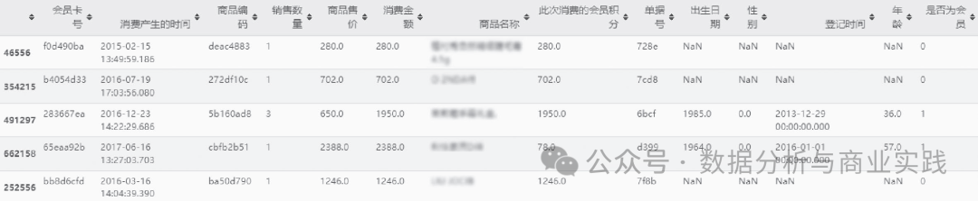 会员卡号:用户注册会员后,平台自动为其分配的唯一标识符。消费产生的时间:用户某笔消费产生的时间,精确到秒。商品编码与商品名称:每一个商品名称都对应着唯一标识编码。销售数量、商品售价:消费金额:消费金额(元)=商品售价×销售数量。此次消费的会员积分:一般情况下(除打折或不参与积分的商品),消费金额数=积分数,即1元相当于1积分。单据号:此次消费的电子单据号,唯一标识。出生日期、性别、年龄:用户的个人信息。