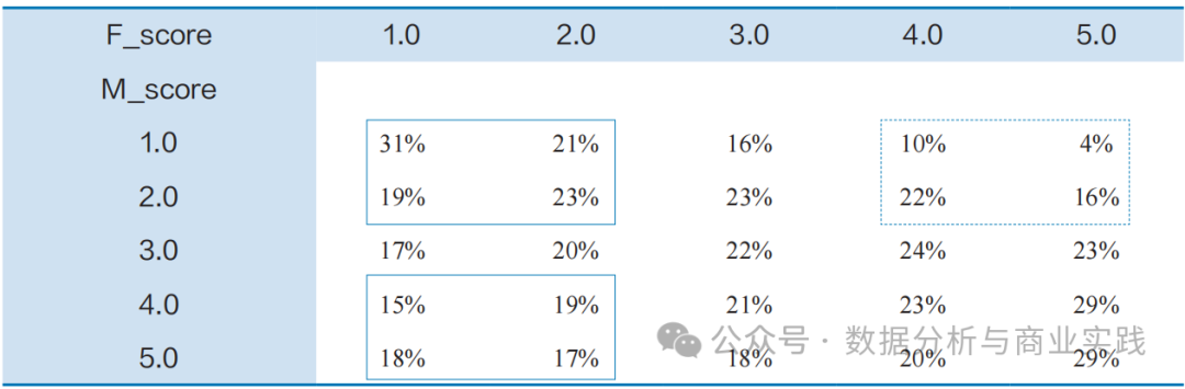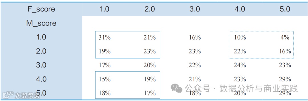 实线方框内数字中可能存在「对价格敏感的客户」(F、M都低)和「喜欢囤货的客户」(F低、M高) 虚线方框内数字中可能存在「忠诚度高但对价格敏感的客户」(F高M低,多在有优惠时出现)。
