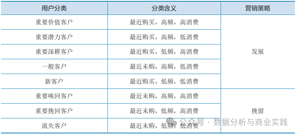 一般来说,RFM分出的每类客户,都有着对应且通用的营销策略。比如,对R值、F值都比较低的客户进行唤醒和挽留;激励和发展那些R值、F值高但M值低的用户。其实在笔者看来,营销策略可以被概括为「发展」和「挽留」两大类(表17-12),只不过在面对不同类客户时,“发展”或者“挽留”的程度和手段不同而已。