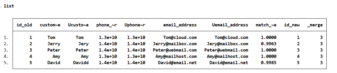 根据新生成的变量match_score的得分来看,“Jerry”的得分为0.9963,“David”的得分为0.9985其余观测值的得分均为1。也就是说,除了Jerry和David的记录外,其他记录在两个数据集中都完全匹配。对于Jerry和David,尽管存在轻微的拼写差异,但匹配得分仍然非常高,表明这些记录很可能是同一客户。在实际应用中,可能需要进一步的人工检查来确认这些匹配是否准确。