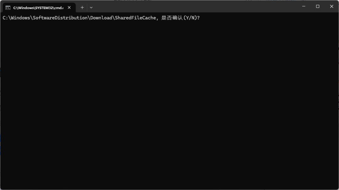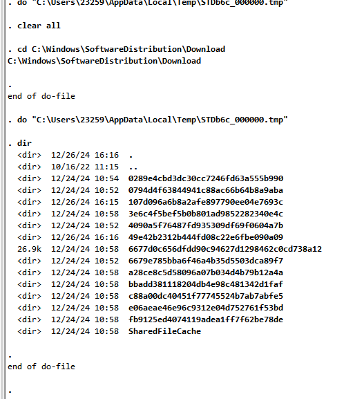 clear allcd C:\Windows\SoftwareDistribution\Downloaddir! RMDIR C:\Windows\SoftwareDistribution\Download\SharedFileCache /s // 这里列举删除某一子目录里的文件方式,/s参数表示删除指定目录和所有子目录