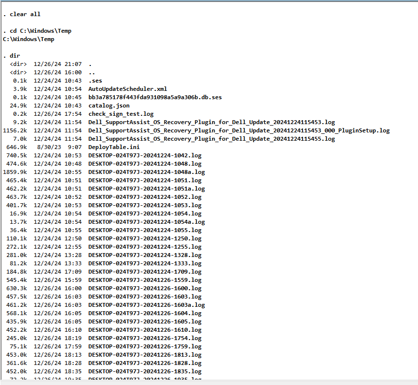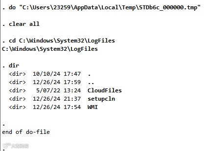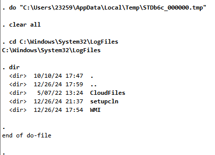 clear allcd C:\Windows\System32\LogFilesdir! RMDIR C:\Windows\System32\LogFiles\CloudFiles /s! RMDIR C:\Windows\System32\LogFiles\setupcln /s! RMDIR C:\Windows\System32\LogFiles\WMI /s