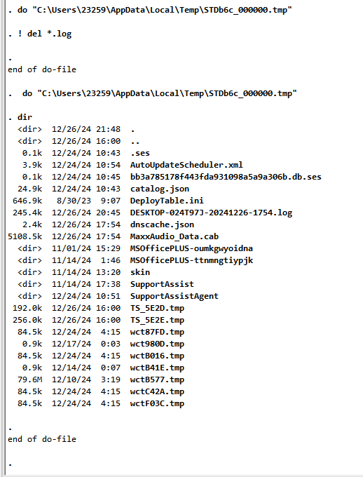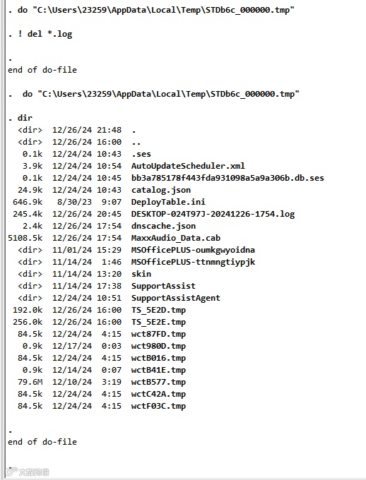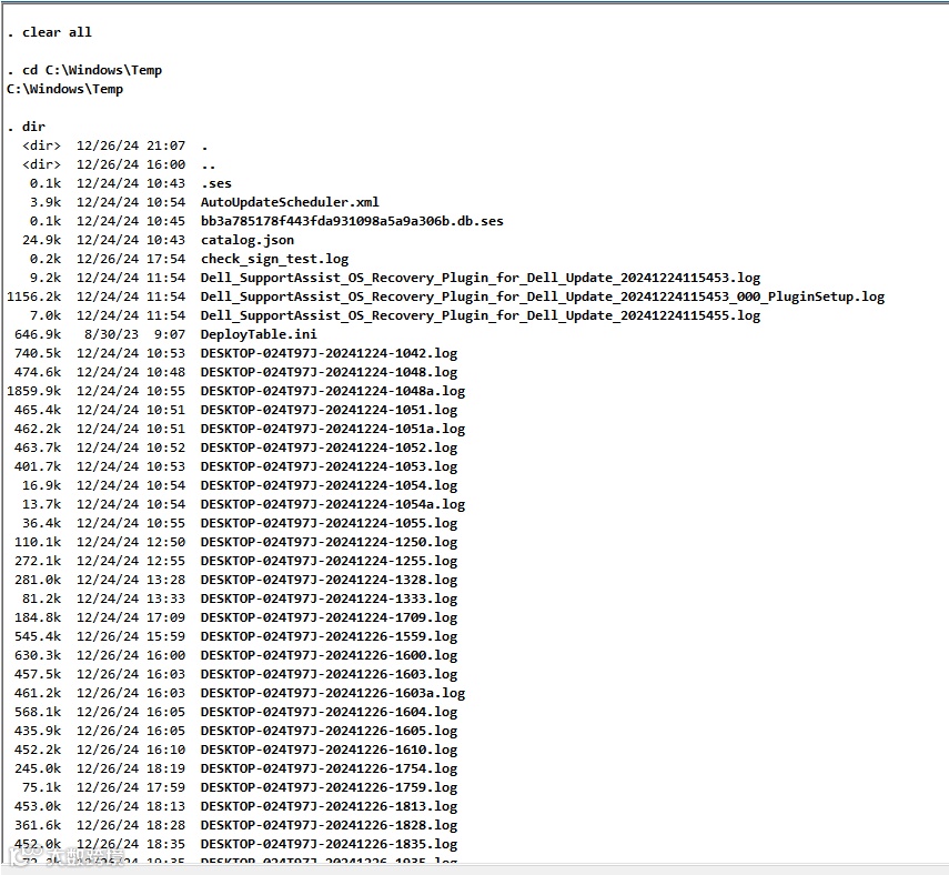 clear allcd C:\Windows\Tempdir! del *.log //此处以删除.log后缀的文件为例dir