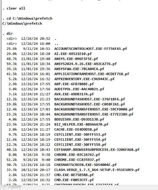 clear allcd C:\Windows\prefetch //找到需要清除内容的子目录dir //查看目录下的文件特征! del *.pf //删除后缀为当前未读取运行的 .pf文件dir