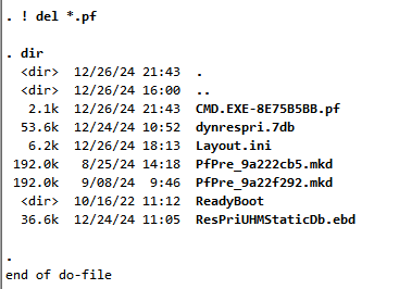 不过随着系统的使用和时间的推移,Prefetch文件夹中可能会累积很多无用的预读取文件,它们不仅占用磁盘空间,还可能影响系统的启动速度。因此,我们可以通过Prefetch文件夹中删除无用的预读取文件,以释放磁盘空间,提高系统的启动速度。结合上期推文中的DOS命令,我们使用“dir”和“! del”命令来查看文件夹目录,并删除无用的后缀为pf的文件。具体命令如下:
