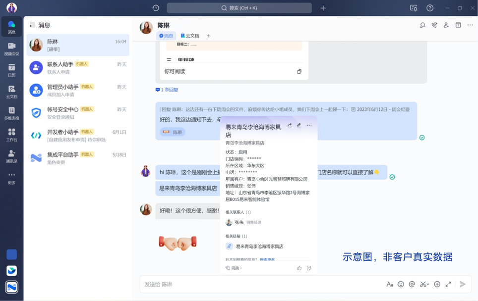 因此,易来还将 CRM 系统中的数据写入飞书词典并转化为词条,让员工在飞书聊天、读文档时点击下划线,就能“一键预览”所需的门店、编码、相关对接人等详细信息,让“信息查询”在协作办公中变得更加丝滑。当业务系统中信息变化时,词典内容也会保持更新,让员工看到的信息总是“最新版”。