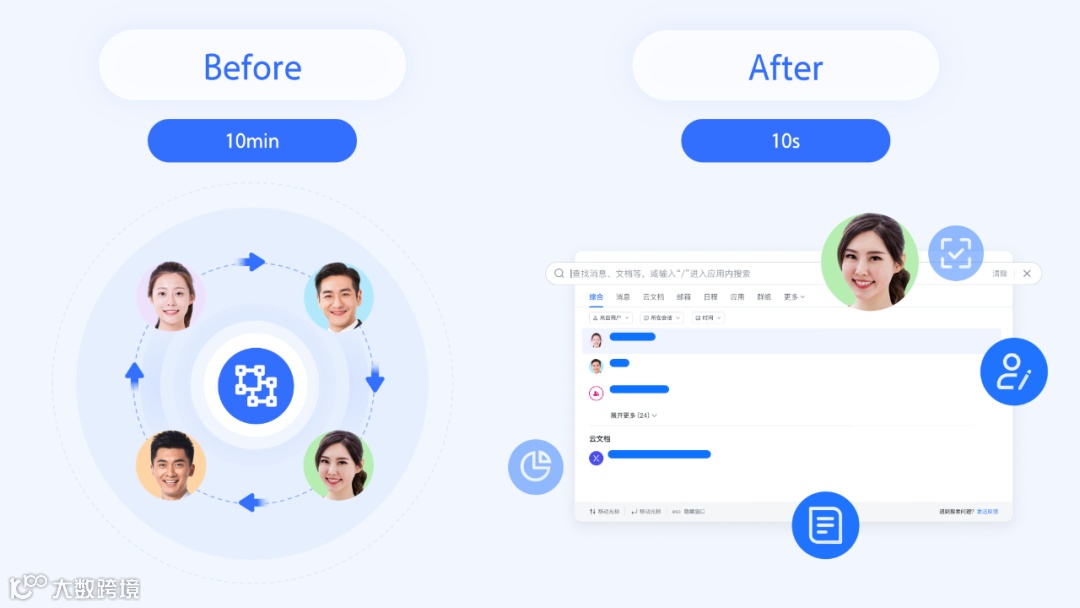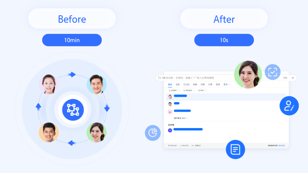 在易来的飞书中,一个小小的搜索框连接起几大信息孤岛,一张小小的卡片让信息触手可及。让信息查找和团队沟通都更加丝滑,大幅提高了业务效率,使数据实现 1+1>2 的效果。