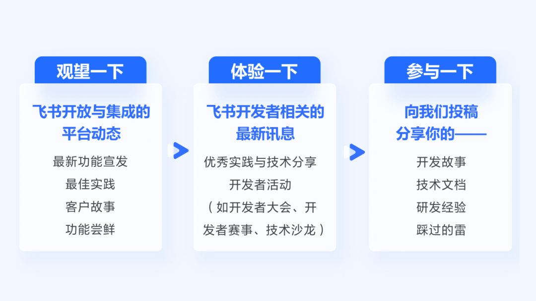 首先,如果你想观望一下,那么你在这里可以获取到飞书开放与集成的最新动态,包括新功能预告、最佳实践和客户故事。如果你对某项功能感兴趣,非常欢迎你直接联系我进行新功能试用!