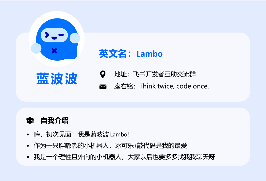 Hi 朋友们,欢迎来到「飞书开发者」公众号,我是你们的朋友,蓝波波!