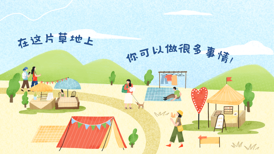 想象一下,这里就像一片生机勃勃的草地,你可以在此自由发挥,参加飞盘大赛、创意市集,甚至是自己来举办草地音乐节和篝火晚会……让我们共同创造精彩吧!