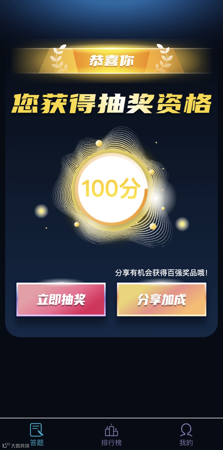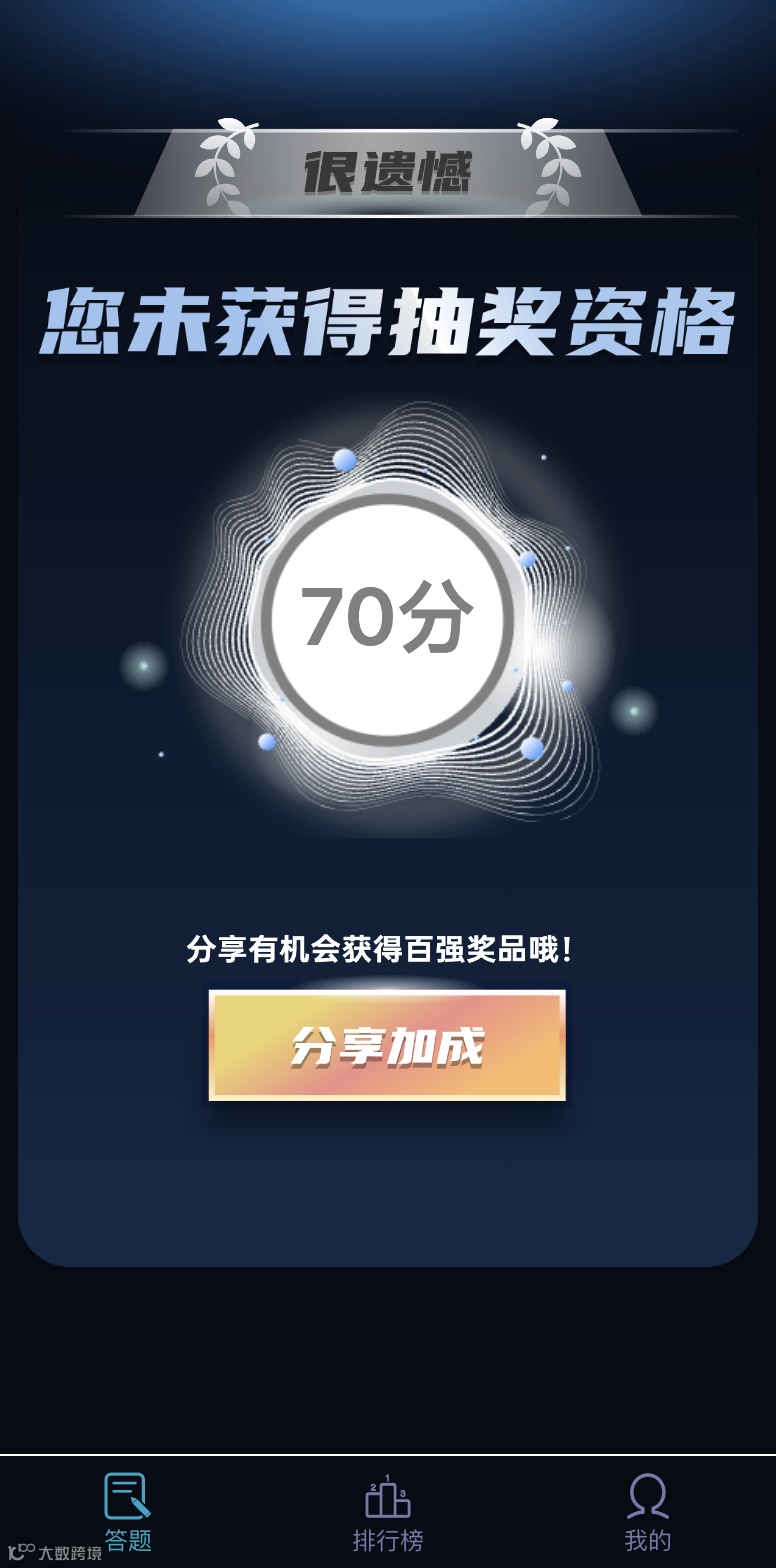 答题满足80分可以抽奖,未达到则提示分享,展示两种完全不一样的界面效果。