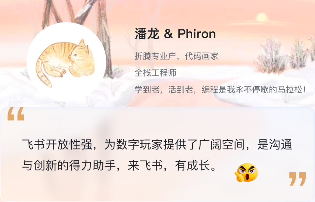 今天的主角是开发者——潘龙 & Phiron,为了快乐迎接 2024 ,他借助飞书开放能力,在飞书做了一款精彩的答题小程序,和 Lambo 一起看看吧~