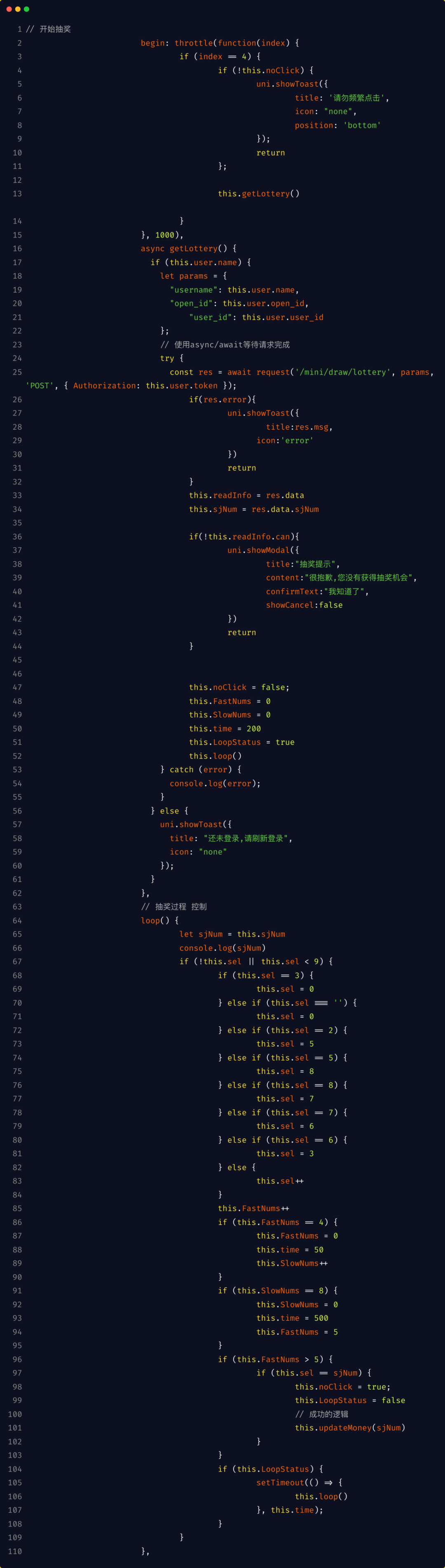 抽奖这里也比较复杂,首先得在数据库设计好奖品奖池和中奖概率,然后抽奖时用户点击抽奖,后端通过计算得出中奖结果并返回给前端,前端再根据结果做一个小动画渲染抽奖的过程。