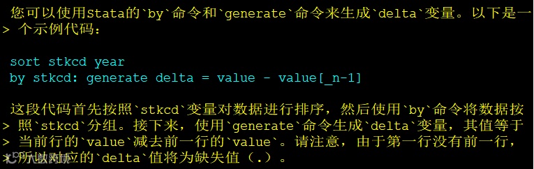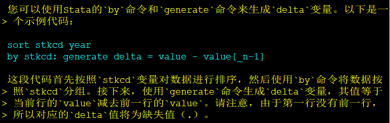 chatgpt read , openai_api_key($OPENAI_API_KEY) stata ///command("观察数据详情,请指出如何通过stkcd和year生成delta") ///do("list")