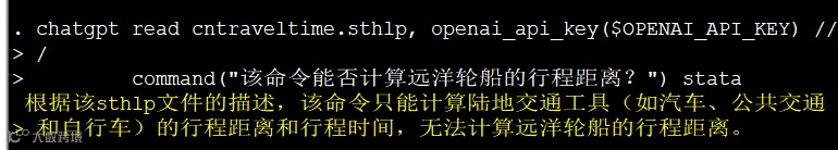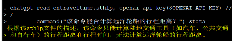 chatgpt read cntraveltime.sthlp, openai_api_key($OPENAI_API_KEY) ///command("该命令能否计算远洋轮船的行程距离?") stata