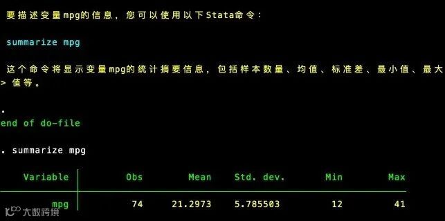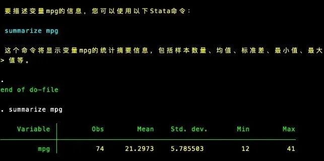 clear allsysuse auto,clearglobal OPENAI_API_KEY " YOUR OPENAN API KEY "chatgpt talk, openai_api_key($OPENAI_API_KEY) command("如何描述变量mpg的信息") stata