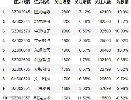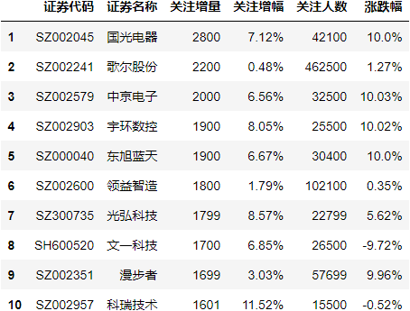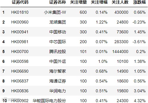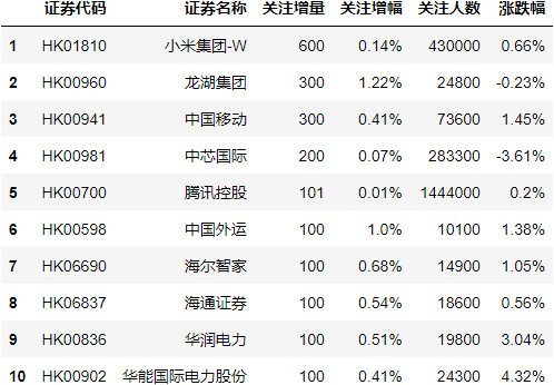 最后,我们为大家揭秘雪球网(https://xueqiu.com/)最新所展示的沪深证券和港股关注人数增长Top10。