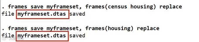 使用frames save命令进行操作:frames save myframeset表示将多框架的数据保存至myframeset.dtas文件。指定frames(census housing)表示将census和housing框架保存为myframeset.dtas文件,指定frames(housing)表示只将housing框架保存至myframeset.dtas。