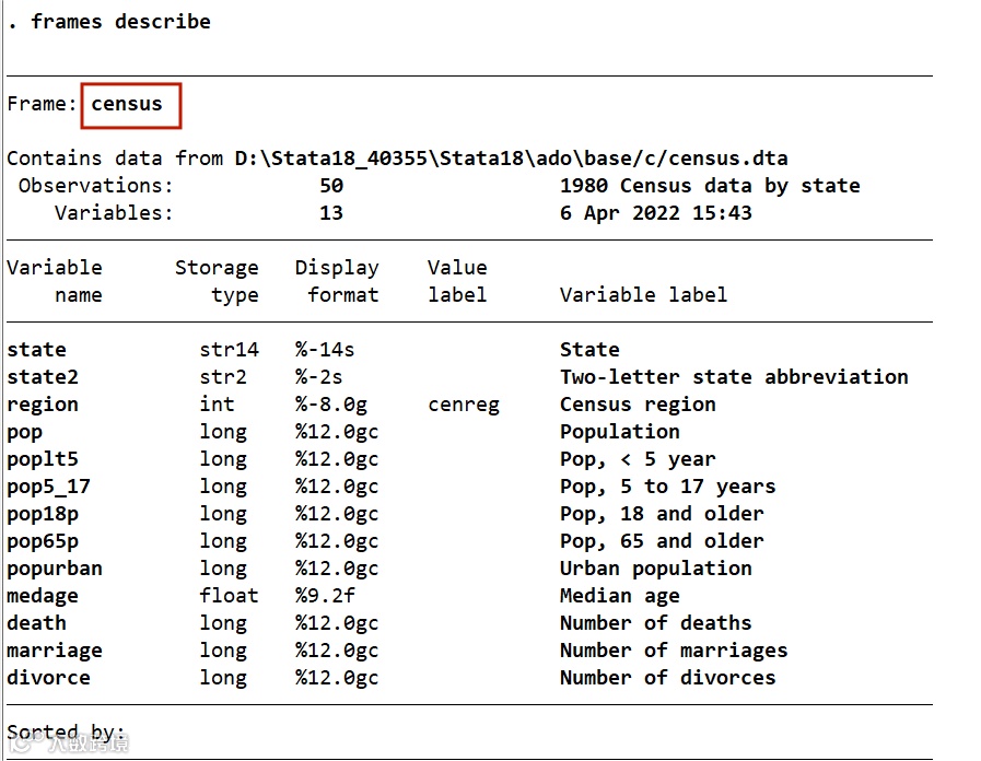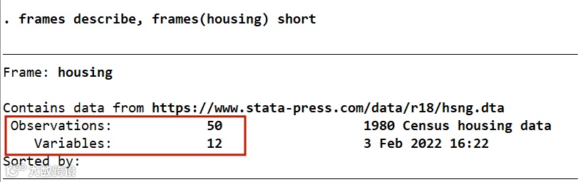 frames describe命令的返回值包括r(frames)、r(first)、r(N)、r(k)等等,r(N)返回每个框架中观测值的个数,r(k)返回每个框架中的变量个数。