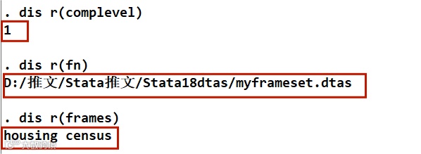 frames save命令提供了返回值,比如r(complevel)、r(compsize)、r(fn)、r(frames)、r(first)等等。