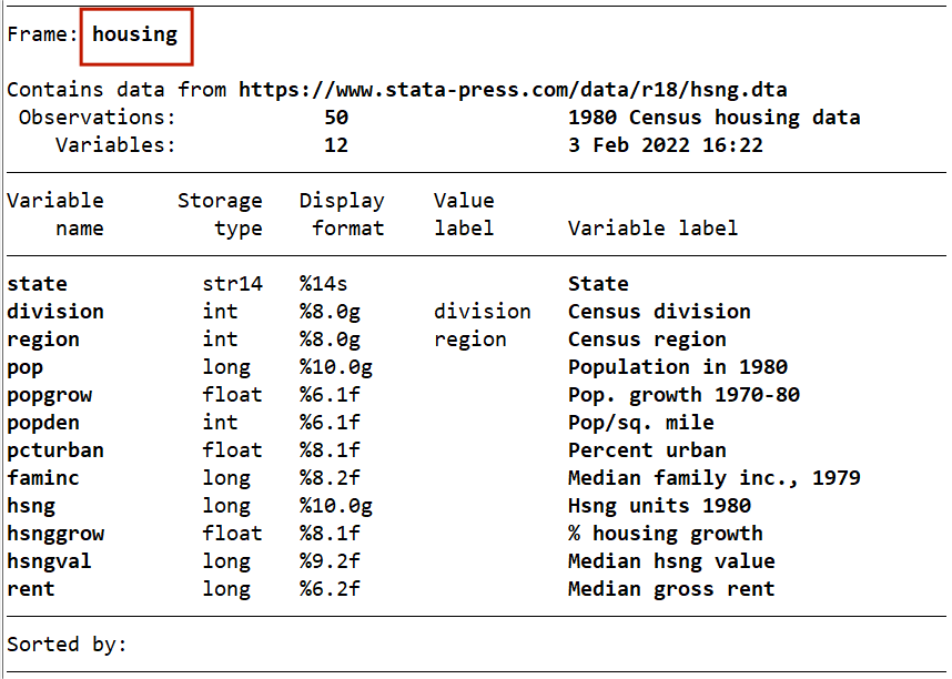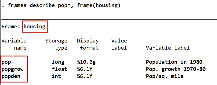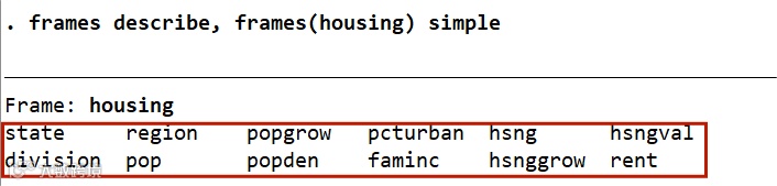 通过frame()和varlist选项可以指定框架名称和变量名称。如下给出housing框架中以pop开头的变量名的变量信息。