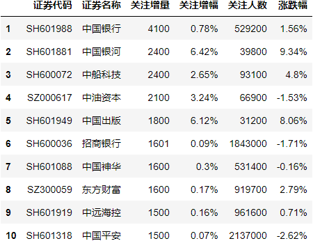 最后,我们为大家揭秘雪球网(https://xueqiu.com/)最新所展示的沪深证券和港股关注人数增长Top10。