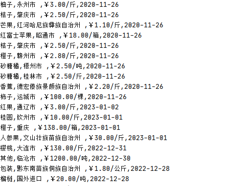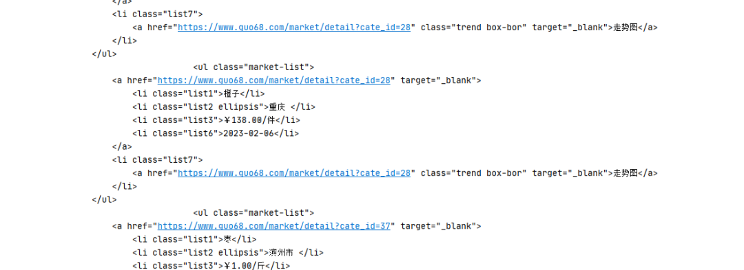 def spider(url):resp = requests.get(url, cookies=cookies, headers=headers).texthtml = etree.HTML(resp)table = html.xpath('/html/body/div[3]/div/div[1]/div[3]/div[2]/ul/a')for tr in table : #table仍保留了xpath属性,我们可以借此生成工整的信息格式txt = tr.xpath('./li/text()') #在此将每个<a>标签中的文字信息提取csv.writerow(list(txt)) #将一组<a>标签中的信息以列表形式传入if __name__ == '__main__':f = open('data.csv', encoding='utf-8', mode='w', newline='') #newline去除空行csv = csv.writer(f) #提前打开为对象,避免反复打开文件耗时start=time.time() #可以提前import time进行测试的计时操作for i in range(1, 200):url=f'https://www.guo68.com/market?page={i}'spider(url)end=time.time()print(f"耗时:{end-start}s")