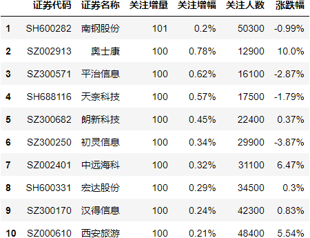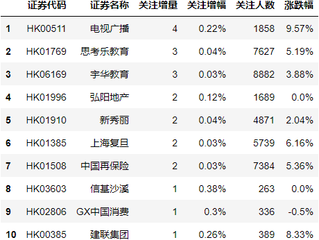 最后,我们为大家揭秘雪球网(https://xueqiu.com/)最新所展示的沪深证券和港股关注人数增长Top10。