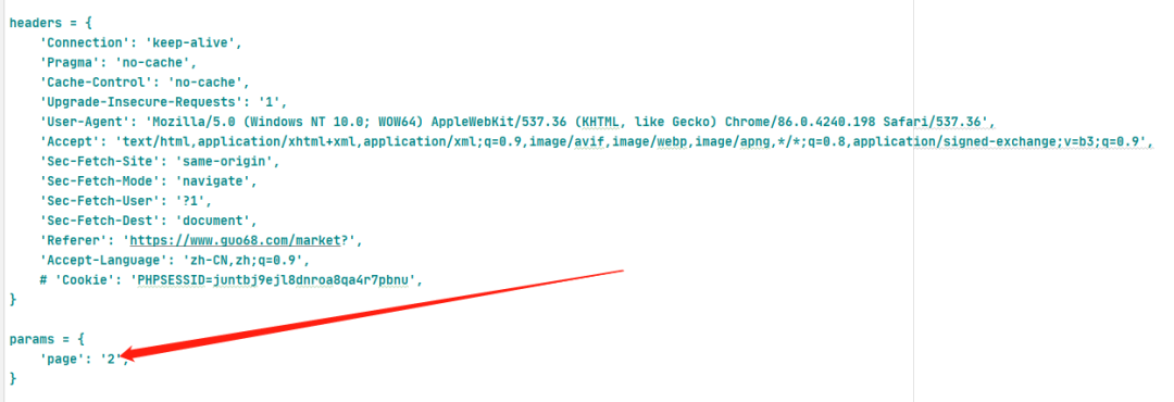 import requestscookies = {'PHPSESSID': 'juntbj9ejl8dnroa8qa4r7pbnu',}headers = {'Connection': 'keep-alive','Pragma': 'no-cache','Cache-Control': 'no-cache','Upgrade-Insecure-Requests': '1','User-Agent': 'Mozilla/5.0 (Windows NT 10.0; WOW64) AppleWebKit/537.36 (KHTML, like Gecko) Chrome/86.0.4240.198 Safari/537.36','Accept': 'text/html,application/xhtml+xml,application/xml;q=0.9,image/avif,image/webp,image/apng,*/*;q=0.8,application/signed-exchange;v=b3;q=0.9','Sec-Fetch-Site': 'same-origin','Sec-Fetch-Mode': 'navigate','Sec-Fetch-User': '?1','Sec-Fetch-Dest': 'document','Referer': 'https://www.guo68.com/market?','Accept-Language': 'zh-CN,zh;q=0.9',# 'Cookie': 'PHPSESSID=juntbj9ejl8dnroa8qa4r7pbnu',}resp = requests.get('https://www.guo68.com/market', cookies=cookies, headers=headers).textprint(resp)