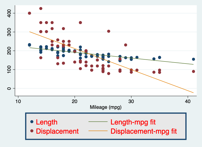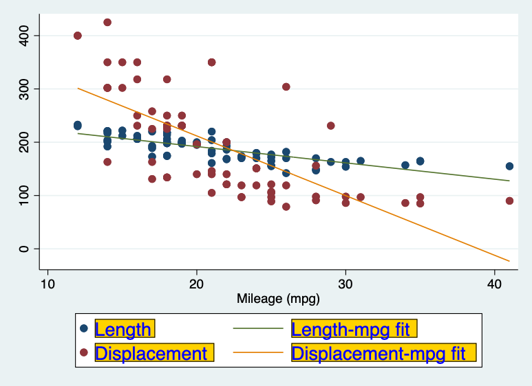twoway (scatter length displacement mpg) (lfit length mpg) (lfit displacement mpg),legend(label(1 "Length") label(2 "Displacement") label(3 "Length-mpg fit") label(4 "Displacement-mpg fit") colfirst size(large) color(blue) fcolor(gold) box)