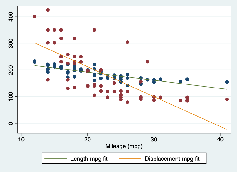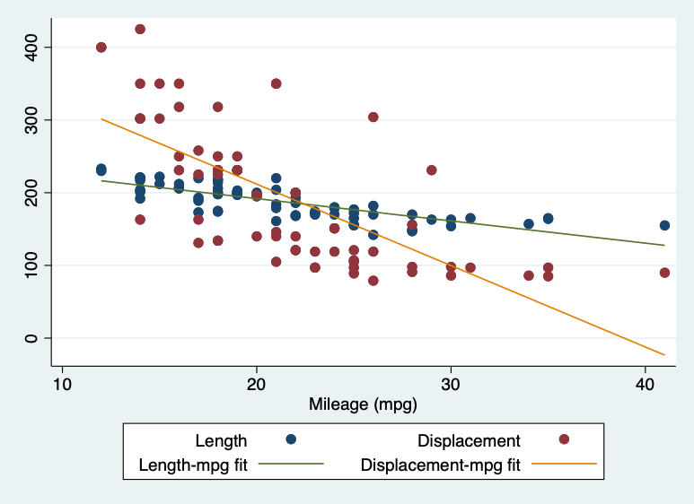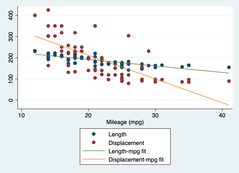 twoway (scatter length displacement mpg) (lfit length mpg) (lfit displacement mpg),legend(label(1 "Length") label(2 "Displacement") label(3 "Length-mpg fit") label(4 "Displacement-mpg fit") colfirst)