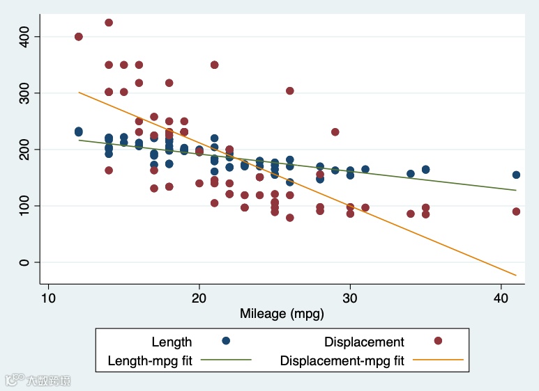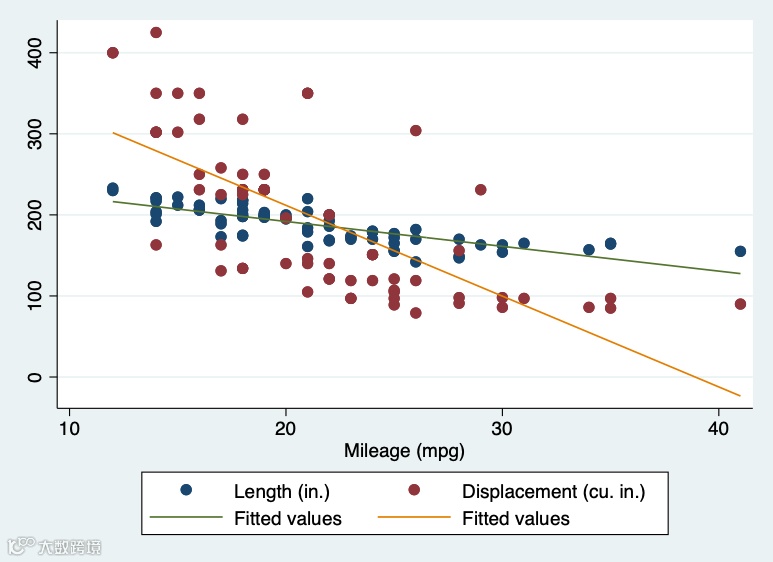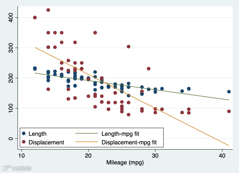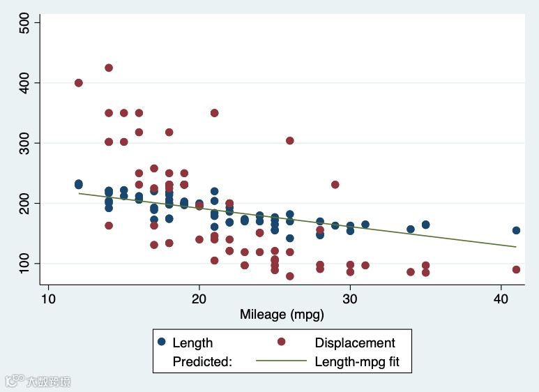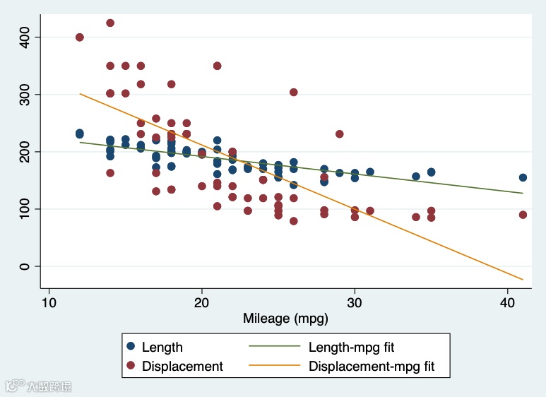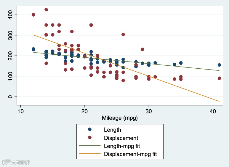 我们使用auto.dta绘制变量length对displacement、mpg的散点图并对其进行线性拟合。