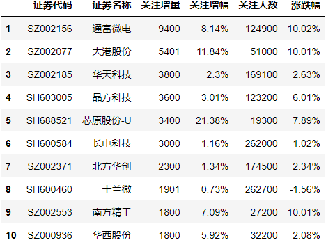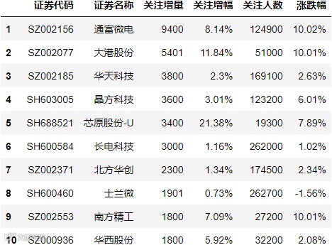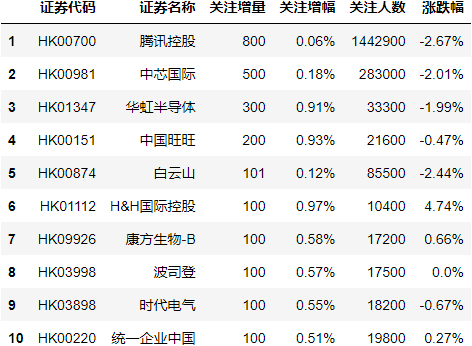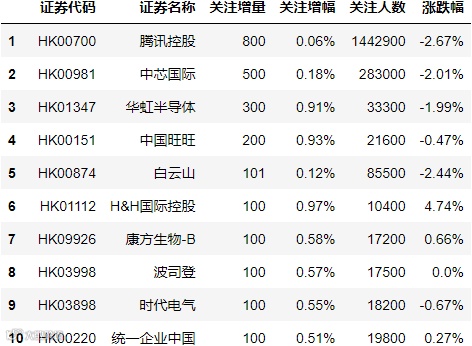 最后,我们为大家揭秘雪球网(https://xueqiu.com/)最新所展示的沪深证券和港股关注人数增长Top10。