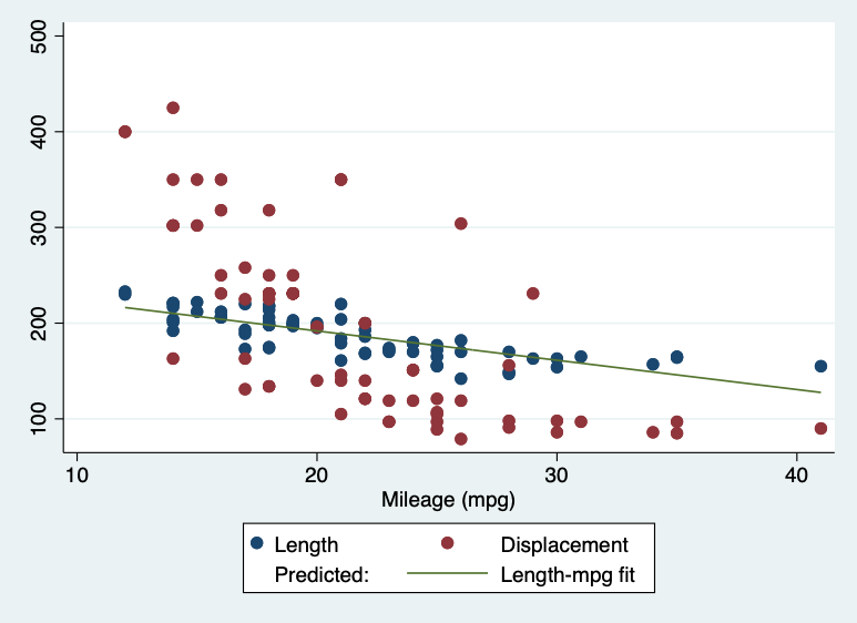 twoway (scatter length displacement mpg) (lfit length mpg), legend(label(1 "Length") label(2 "Displacement") label(3 "Length-mpg fit") order(1 2 - "Predicted:" 3))