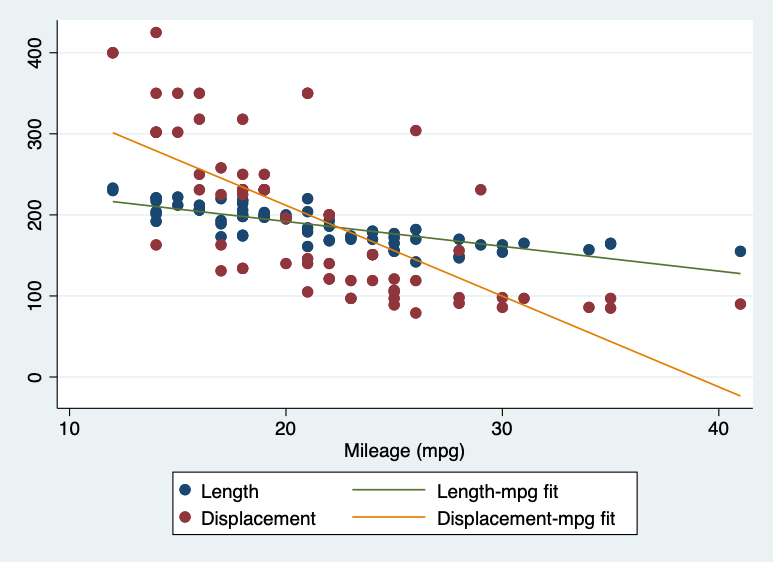 twoway (scatter length displacement mpg) (lfit length mpg) (lfit displacement mpg),legend(label(1 "Length") label(2 "Displacement") label(3 "Length-mpg fit") label(4 "Displacement-mpg fit"))