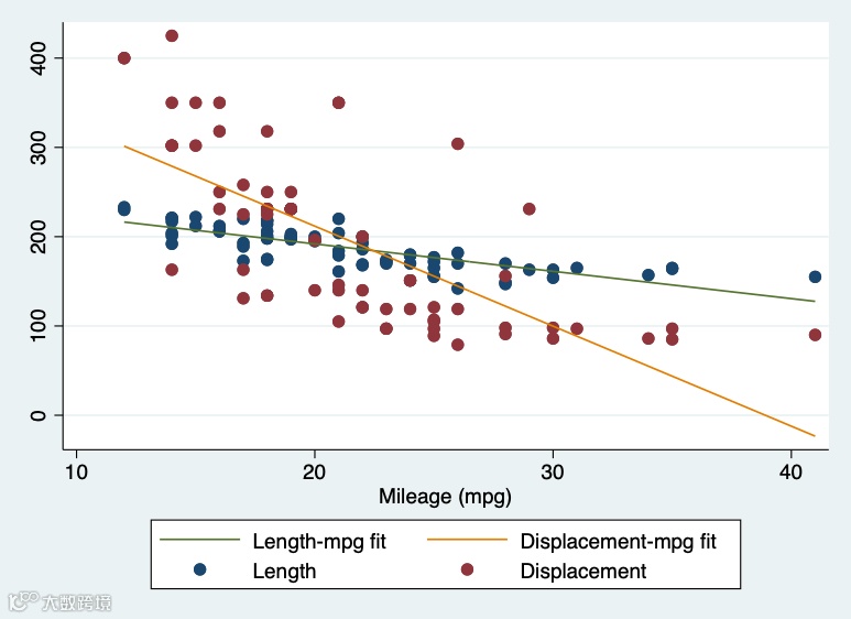 twoway (scatter length displacement mpg) (lfit length mpg) (lfit displacement mpg),legend(label(1 "Length") label(2 "Displacement") label(3 "Length-mpg fit") label(4 "Displacement-mpg fit") textfirst)