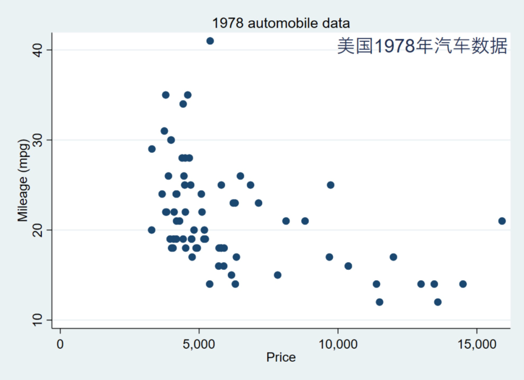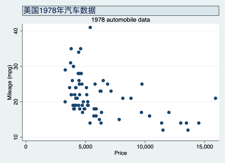 scatter mpg price,title("美国1978年汽车数据",position(1) ring(0)) subtitle("1978 automobile data")