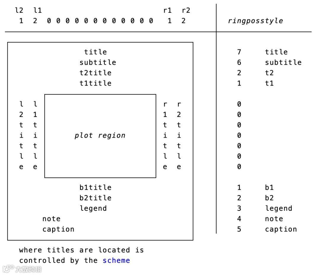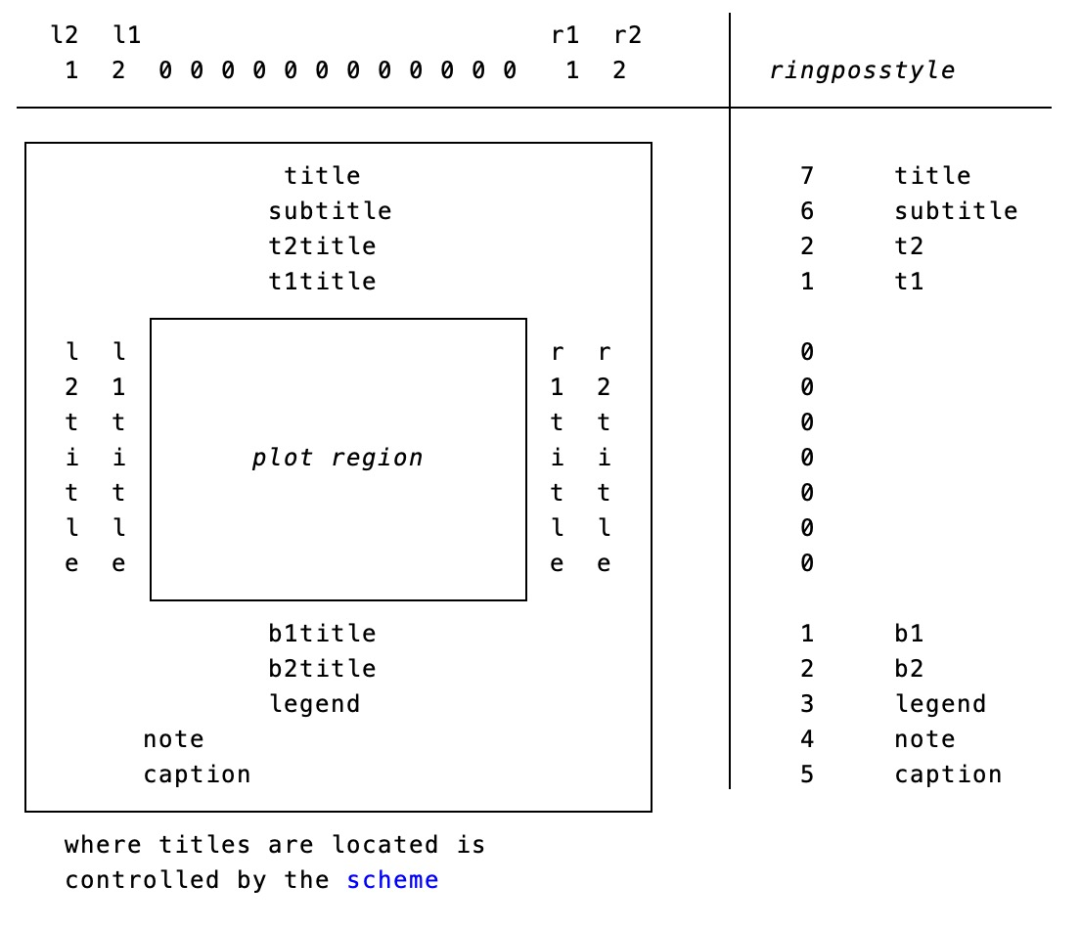 ring(#)中,#取[0,100]内的实数。下图是Stata官方给出的示意图标明了ringposstyle取不同值的标题位置,以及标题、副标题等的默认位置。可以看出,#为0表示在绘图区域(plot region)内,#>0,指定为绘图区域外的位置,该值越大,离绘图区域越远。