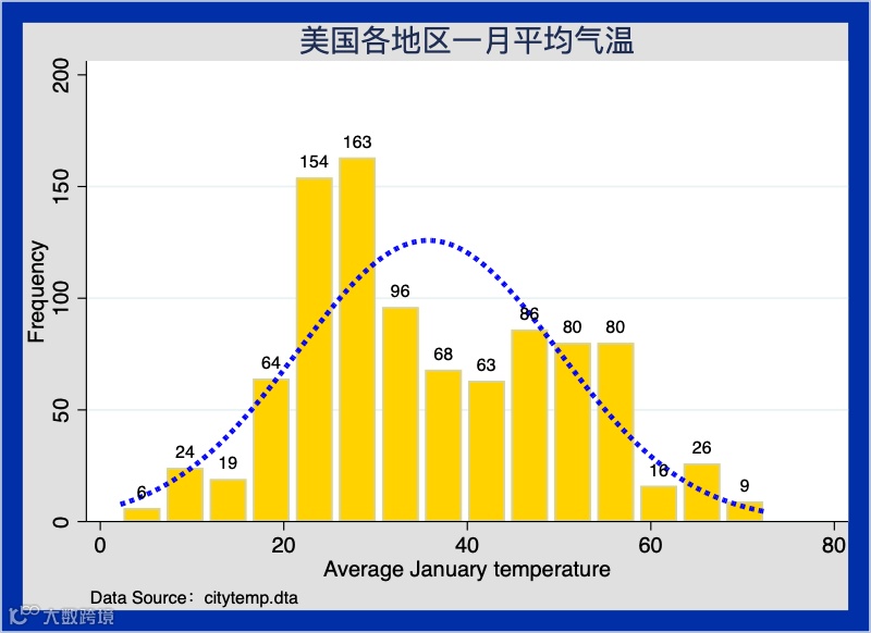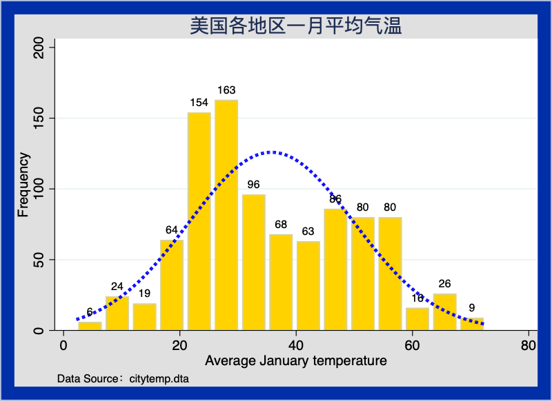 clear allsysuse citytemp, clearhistogram tempjan,bin(15) gap(15) frequency addlabels fcolor(gold) normal normopts(lcolor(blue)lwidth(thick) lpattern(shortdash)) title(美国各地区一月平均气温) note(Data Source:citytemp.dta) graphregion(ifcolor(gs14) fcolor("0 47 167"))