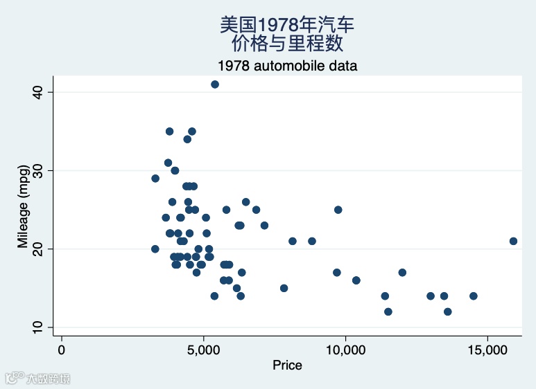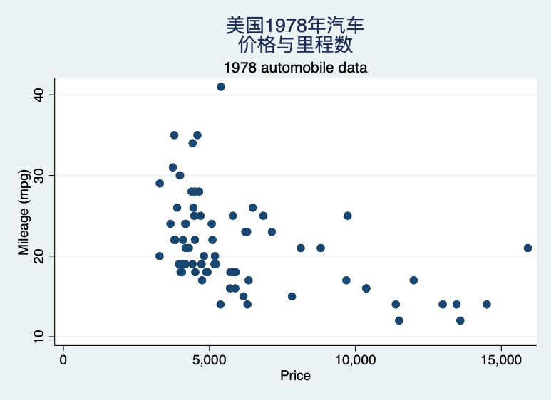 scatter mpg price,title("美国1978年汽车数据",box bexpand justification(left)) subtitle("1978 automobile data")