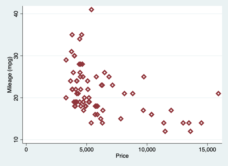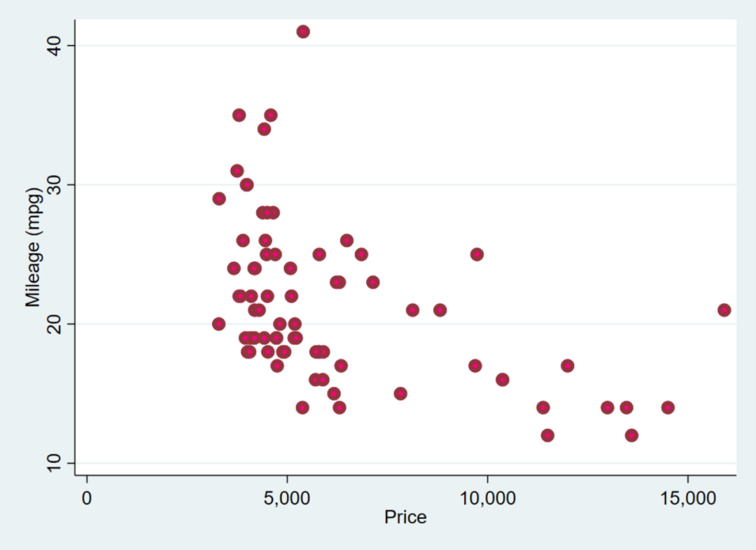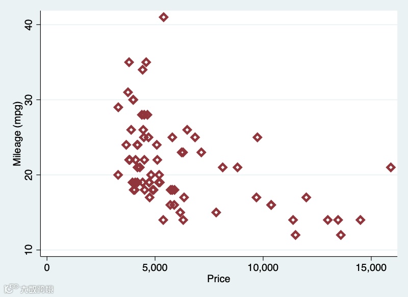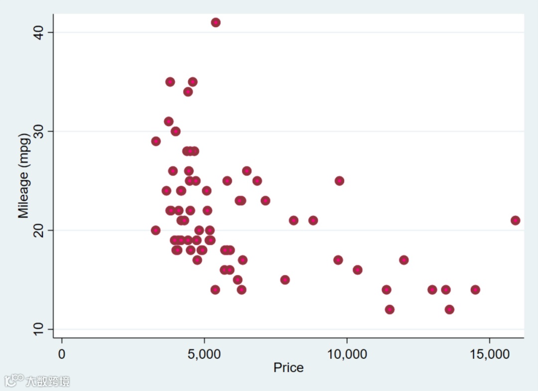 我们使用数据auto.dta来绘制汽车价格Price与耗油量Mileage的散点图,将点的内部填充色与轮廓线颜色设置成不同的颜色,轮廓线粗细设置为thick并内部对齐,点的大小为medium。具体代码如下: