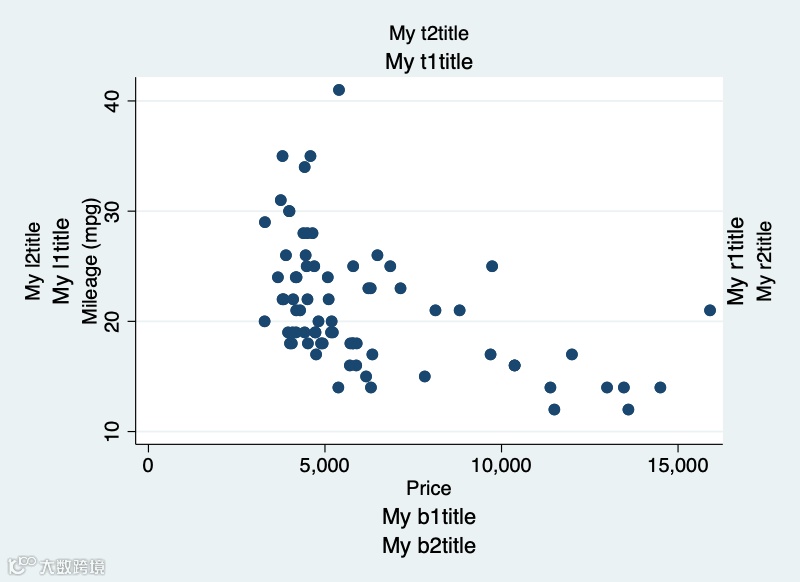 scatter mpg price,t1title("My t1title") t2title("My t2title") b1title("My b1title") ///b2title("My b2title") l1title("My l1title") l2title("My l2title") ///r1title("My r1title") r2title("My r2title")