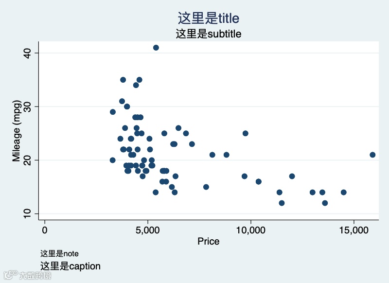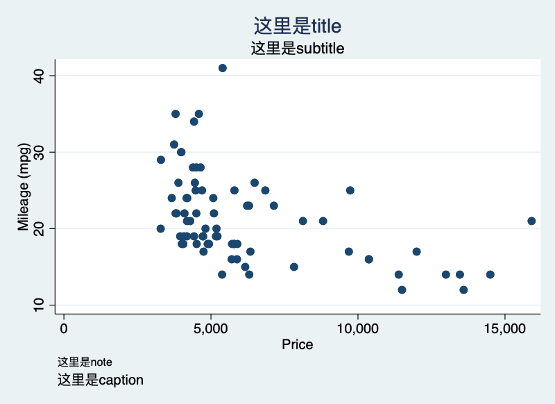 sysuse auto, clearscatter mpg price,title("这里是title") subtitle("这里是subtitle") note("这里是note") ///caption("这里是caption")