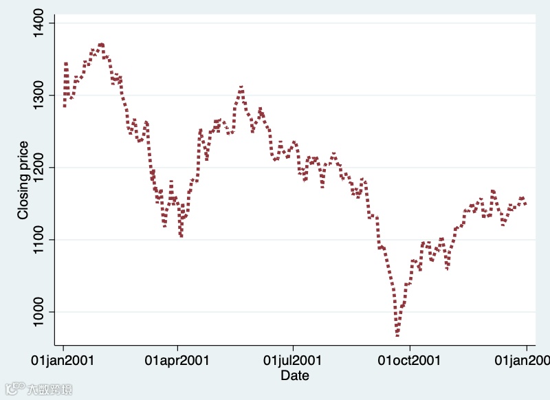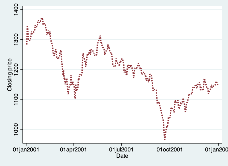 sysuse sp500, cleartwoway line close date, lwidth(thick) lcolor(maroon) lpattern(shortdash)