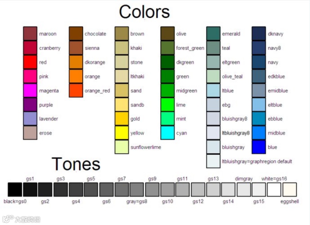 在Stata绘图中,颜色是最经常使用的选项之一,图形本身、绘图背景、坐标轴等的关于颜色的具体选项有: