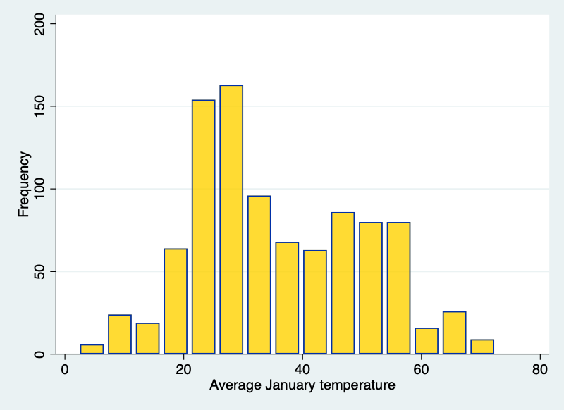 histogram tempjan, bin(15) gap(15) frequency fcolor(gold%80) lcolor("0 47 167")