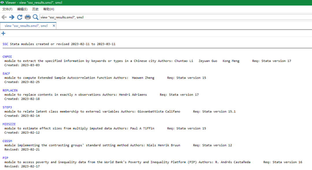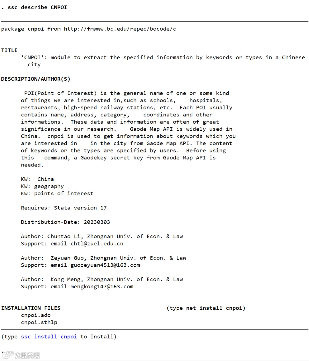 只需要在命令框中输入ssc new就可以得到最新的包,并且可以单击一个包了解并安装它。从图中可以看到目前最新的Stata命令是CNPOI命令,POI是我们感兴趣的一种或某种事物的总称,如学校、医院、高铁站等。CNPOI则可以用于从高德地图API获取你感兴趣的城市的关键词信息。